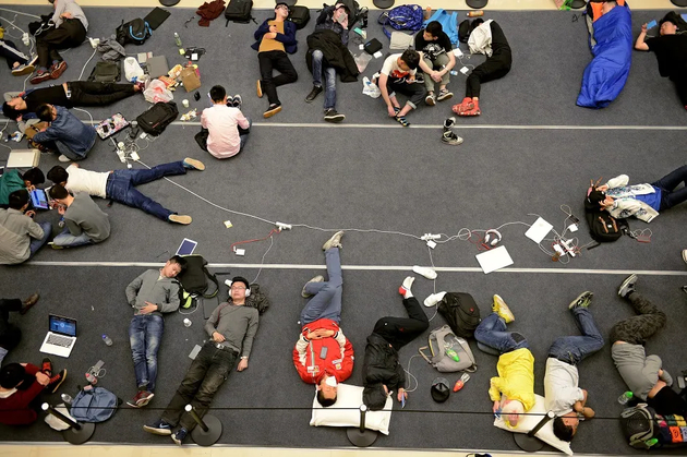 2015年4月24日,苹果在浙江杭州市的一家零售店开张,很多“果粉”自23日晚上就在商场一楼过夜等候。图/视觉中国
