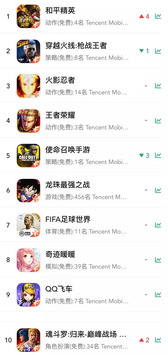 截至发稿,iOS端腾讯旗下排名前十的爆款,图源:七麦数据
