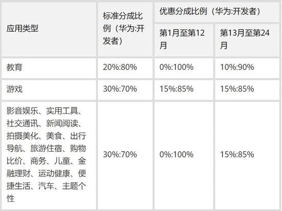 华为应用市场联运服务协议中显示,在基于RSRA(扣除折扣、适用的增值税、退款及渠道费用之后的余额作为收入分成总额)设定的分成比例中,华为与付费游戏应用开发者在中国大陆的分成比例为3:7,而应用内购买的内容及服务或数字内容购买的内容及服务中涉及游戏相关的,华为与开发者间以5:5的分成比例核算。