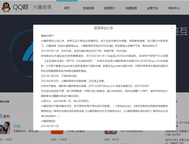 2021年2月26日,兴趣部落将关闭服务器,正式停止运营。