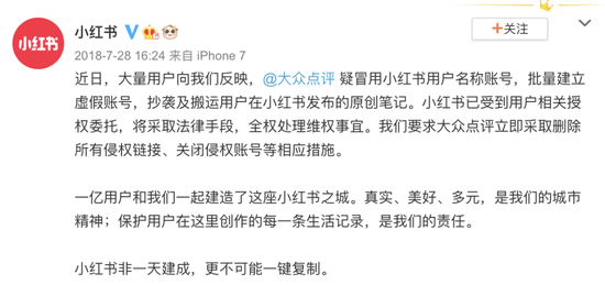 小红书官微也发布了声明谴责大众点评的抄袭行为,称“小红书非一天建成,更不可能被一键复制”。