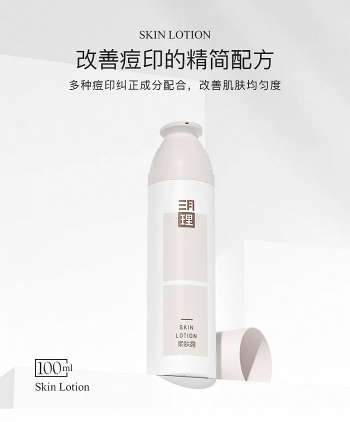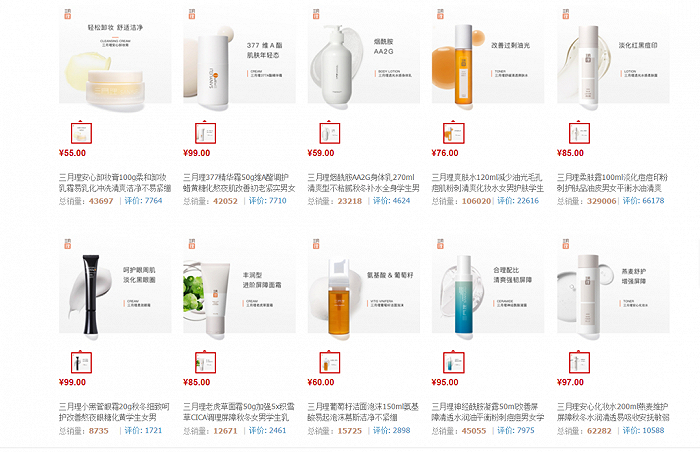 三月理创立于2018年1月,创始人杨卉。是一个纯线上品牌,目前主要销售渠道为天猫旗舰店,粉丝数55.5万。目前共有20几款SKU,单品价格基本不超百元。在成分上除了大热的烟酰胺、神经酰胺、依克多因、果酸之外,还增加了一些植物类的萃取成分,比如老虎草(也就是常说的CICA),五谷发酵精华液、燕麦等。