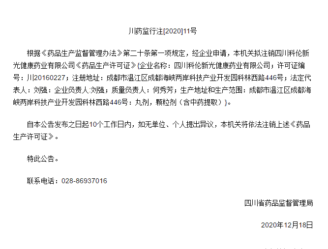 不过从公开资料可以看到在去年12月份的飞行检查中,新光药业共发现缺陷项11项,其中严重缺陷项2项,一般缺陷项9项,被责令限期整改。而之后新光药业已经申请了注销《药品生产许可证》,这意味着其实背后的药厂背书已经没有公信力。