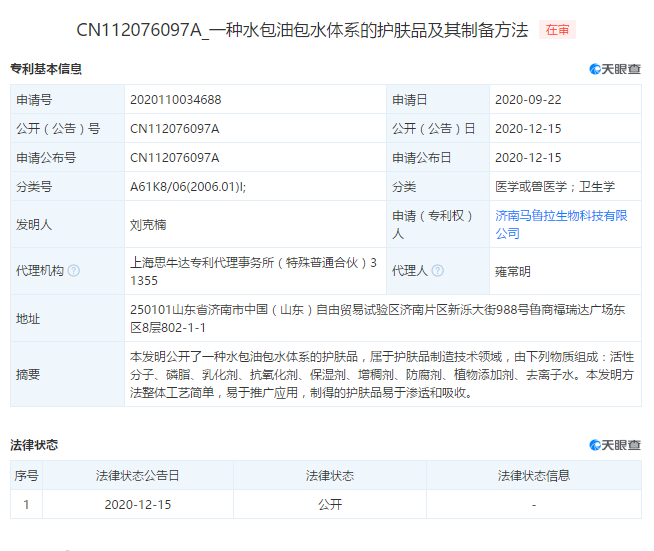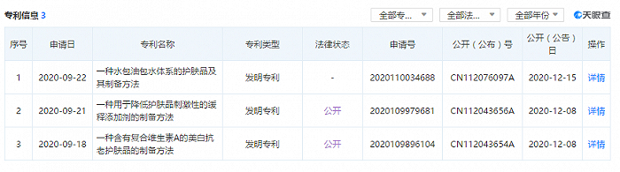 在新条例落地之后,新原料就会向企业开放注册备案,经过药监局测试通过注册通过后即可使用,这意味着将会有更多具有功效性的新成分和新原料将诞生。而很多新锐品牌可以从这当中找到突破口,从天眼查可以看到一些新锐已经开始为特有成分开始申请专利保护。