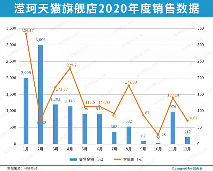 不过从线上数据来看,品牌刚刚上线时比较亮眼,但是后期销售和客单价来看就乏善可陈,或许也跟其品牌发展规划有关,把更多的重心放到了线下渠道。