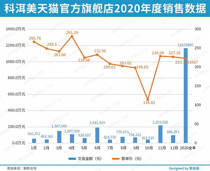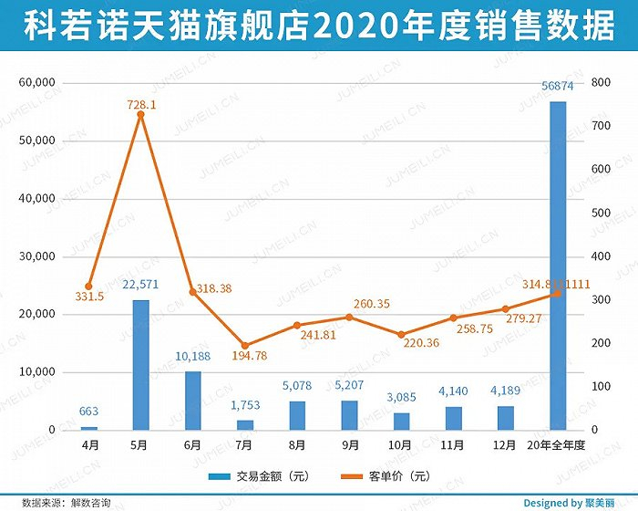 从天猫数据来看,科洱美的店铺流量显然更高,但是从客单价来看,科若诺是本土品牌中少有的客单价能突破300元大关的新锐品牌。