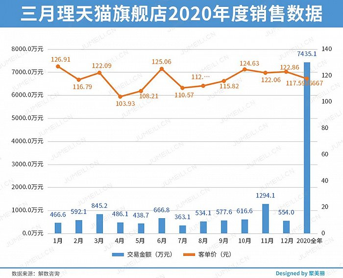 而且虽然三月理的单品不超过百元,但是其客单价还是基本都维持在了100-110元,证明其客户大多数还是会选择两款产品以上进行搭配使用。去年1月份店铺销量在450万左右,年末的月销量在550万左右,有电商大促的的6月份和11月份也没有明显的冲量行为,可以看出其品牌流量已经十分稳定,基本找到自己的品牌发展节奏。