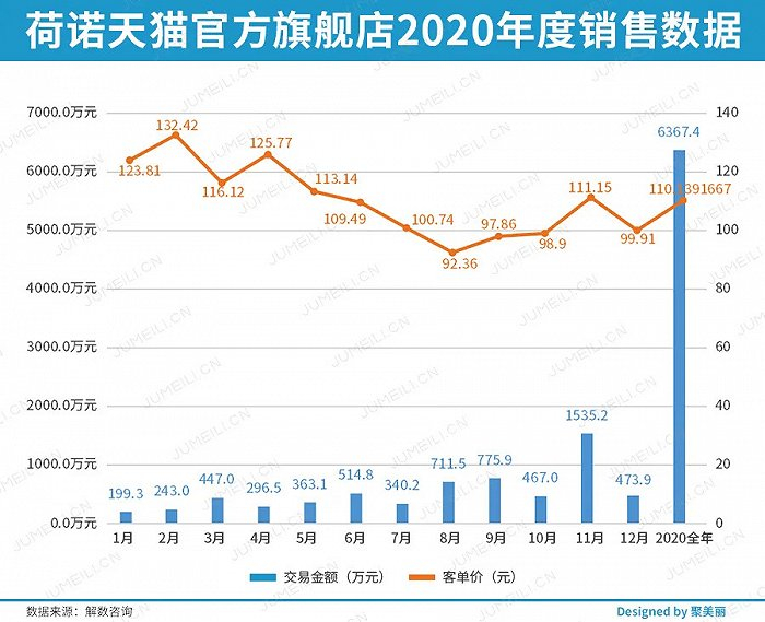 从天猫旗舰店2020年度的销售数据来看,荷诺其天猫流量已经较为稳定,全年单店销售额超过6000万,客单价在110元左右,从每个月的销售数据来看,其销售曲线跟电商大促的节点基本相符,不过12月份的月销售比1月份的销售额还是增长了一倍左右,其销售额整体的曲线还是呈稳定上升的趋势。