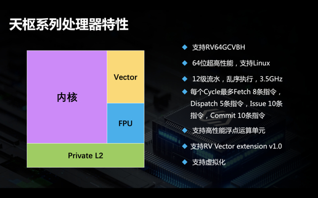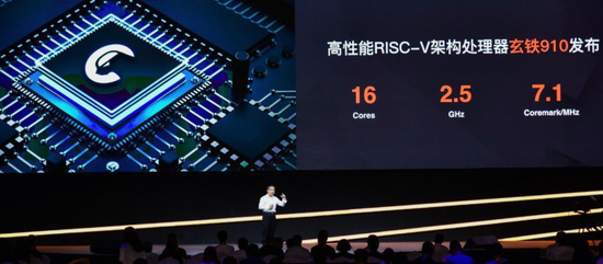 2019年7月,平头哥发布了RISC-VIP核玄铁910。它支持16核,主频可达2.5GHz,单核性能达到7.1Coremark/MHz,较业界主流芯片性能提高40%,较标准指令性能高出20%。