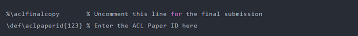 格式检查:格式需要是匿名送审版本。以 LaTeX 模板为例,注释掉 \ aclfinalcopy 命令,并回填投稿编号,例如: