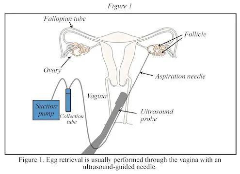 这个过程是通过阴道超声引导的卵母细胞抽吸术来进行的。可以看下面这张图。探入阴道的超声探头装有空心针,针刺穿阴道壁进入卵巢,刺破卵泡吸出卵子。