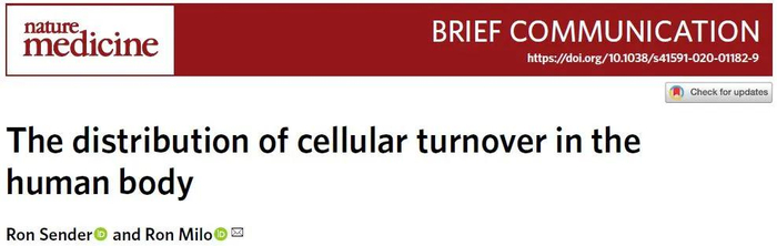 不过,真实的情况可要比这复杂得多。在最新一期《自然-医学》杂志上,以色列魏茨曼科学研究所(Weizmann Institute of Science)的两位科学家Ron Sender博士和Ron Milo教授对人体各种细胞的更新速度做了一次大普查。我们来看看他们得到的结果。