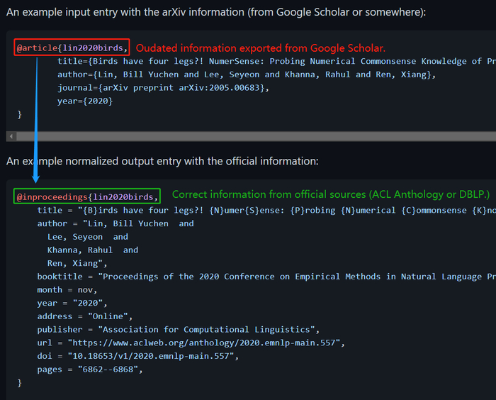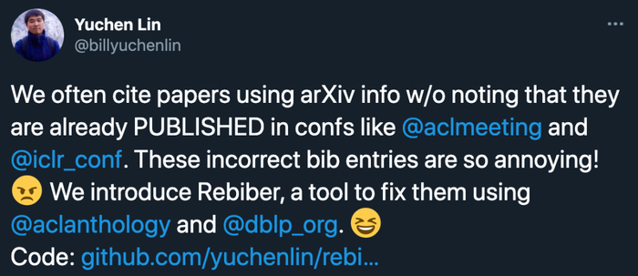 如何解决这一问题呢?最近,上交毕业生、南加州大学博士生林禹臣开发了一个简单的 Python 工具——Rebiber,它能够基于 ACL Anthology 和 DBLP 数据库自动解决这一问题。