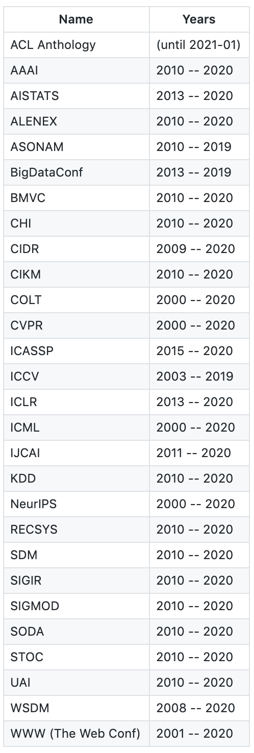 使用者还可以手动添加 DBLP 包含的任意会议:只需从 DBLP 中下载会议 bib 文件至 data 文件夹,然后将其转换为 json 格式,再把路径添加至 bib_list.txt 即可。