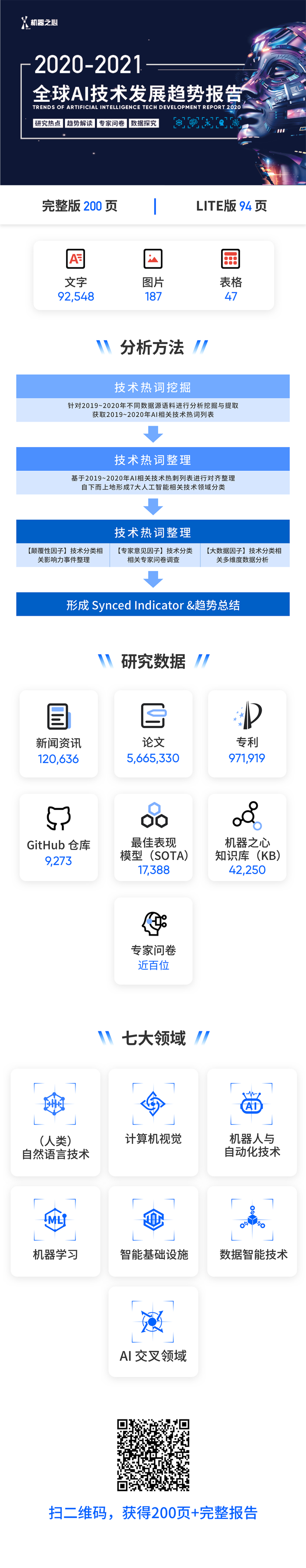 报告内容涵盖人工智能顶会趋势分析、整体技术趋势发展结论、六大细分领域(自然语言处理、计算机视觉、机器人与自动化技术、机器学习、智能基础设施、数据智能技术、前沿智能技术)技术发展趋势数据与问卷结论详解,最后附有六大技术领域5年突破事件、Synced Indicator 完整数据。