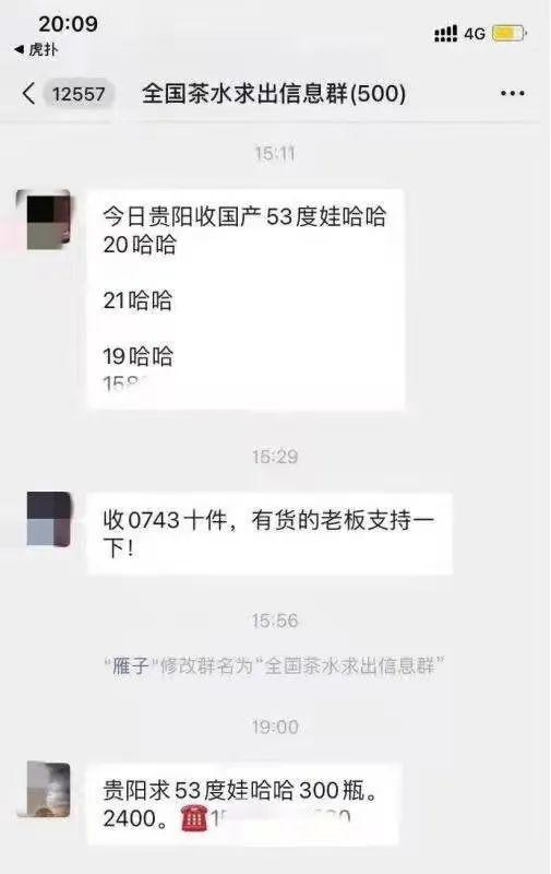 担心被封群,最近群友聊天都很谨慎,提到飞天茅台,一律用娃哈哈、农夫山泉来替代,大家也会经常在群里交流一些茅台酒管控的动态信息,彼此提醒一下。