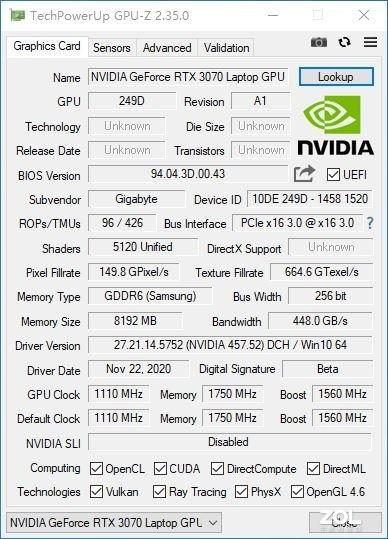 我们再来看看首登移动平台的Nvidia 30系显卡,我拿到的AORUS 15P搭载了115W的移动版本RTX 3070,8GB GDDR6显存,拥有5120个流处理器,显存位宽256bit,基准频率1110MHz,Boost频率1560MHz。