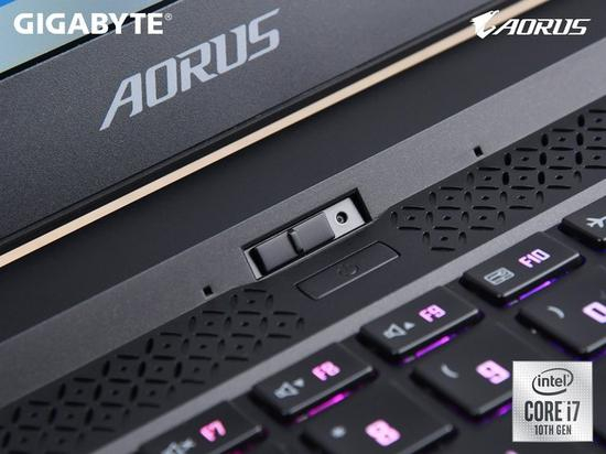 2、屏幕面的上、左、有三边边框仅为3mm,摄像头无处安放,有些厂家可能索性舍弃摄像头,但AORUS 15P的摄像头正好设置在了这个小台阶的斜面上,并拥有一个物理遮挡拨片。