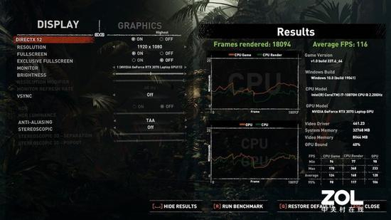 在《古墓丽影:暗影》中,画质调整至最高的“Highest”,使用内置的BenchMark进行测试,平均帧数116帧。