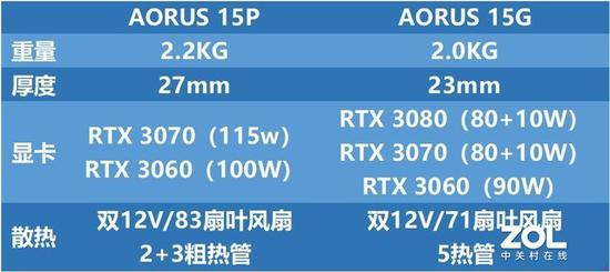 AORUS 15P与15G主要规格差距