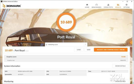 在代表DX12性能的Time Spy测试项目中,这块RTX 3070的得分情况如下: