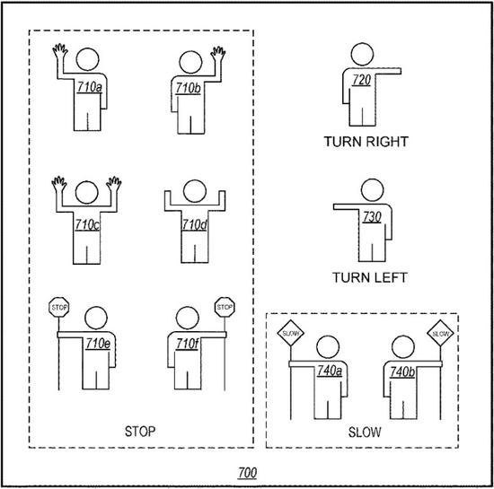 于是,该专利的功能为:交通指挥官的姿态可被车辆解释和理解为执行与交通改道有关的操纵的命令,包括停止、减速或转弯。车辆可能装有命令确认装置,用于向交通指挥官确认车辆对交通改道条件或操纵命令的理解。