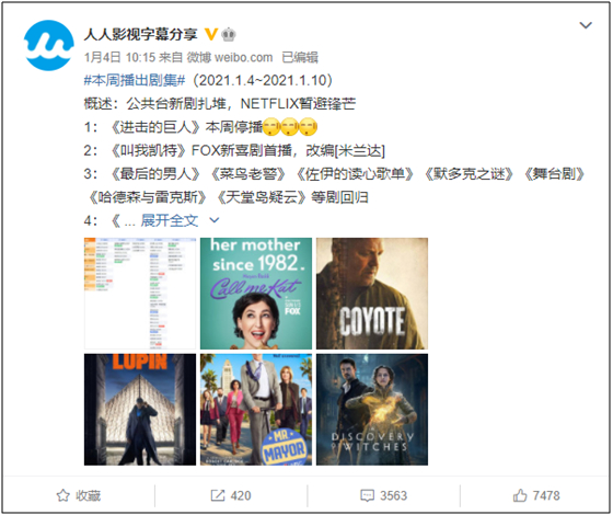 微博“人人影视字幕分享”最近一条还停留在1月4日,之后再没更新过。