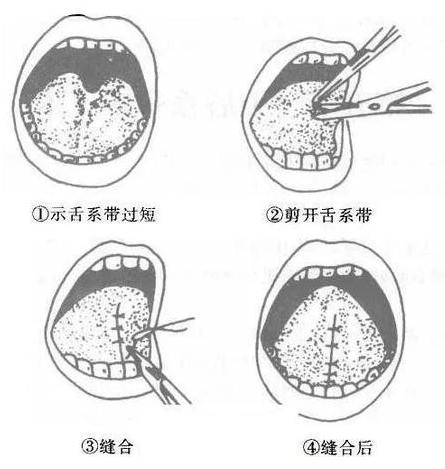 剪舌根的正式名称叫做舌系带矫正手术,就是用血管钳夹住舌系带的上端并向上提起,用小剪刀切断舌系带,再将切口作纵向对位缝合。