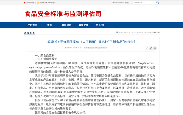 2021年, 1月7日,国家卫生健康委官网发布“三新食品”公告,HAPLEX®Plus透明质酸钠被获批为新食品原料,可应用于普通食品添加。这意味着,透明质酸终端食品市场进一步放开,透明质酸行业迎来新的发展。据悉,此次透明质酸作为新食品原料的申请由华熙生物(688363)主导申报及推进。