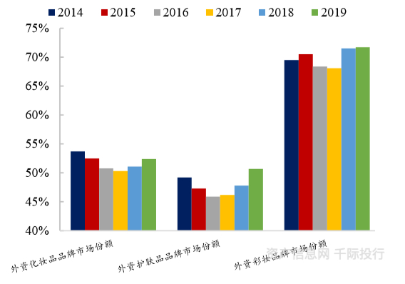 图中国彩妆行业2014-2019年全渠道竞争格局变化(单位:%)