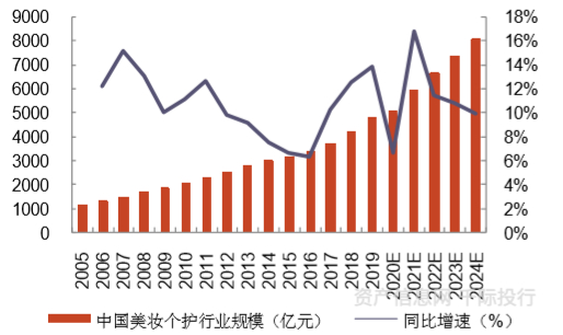 2019年我国化妆品行业整体市场容量达到4777.20亿元,2014-2019年年均复合增长率9.9%,化妆品行业正处于高速增长期。预计2024年我国化妆品行业市场容量将达8282亿元,2019-2024年年均复合增长率约11.6%。2017 年起国内化妆品市场规模重回两位数快速增长阶段,而且在居民收入持续提升、海外消费加速回流、新兴国货及功效性产品层出不穷等因素的推动下,预计国内化妆品行业将延续快速增长态势。