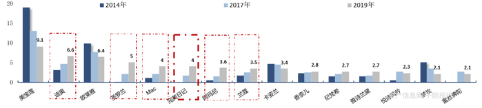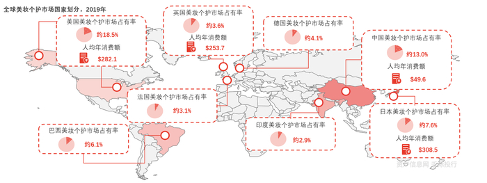 在市场增长方面,中国、巴西和韩国等市场在2014年至2019年的增长率较高,而日本、法国和德国等成熟市场的增长率相对较低。中国是全球美容行业复合年增长率最快的国家,在美妆个护行业显示出巨大的消费潜力。