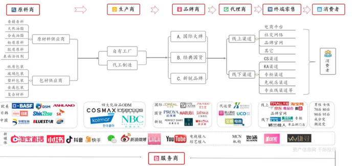 按不同商业形态可划分为商超卖场(KA)、日化专营(CS)、百货专柜、免税和电商渠道等,当前来看,传统线下渠道在近年来行业洗牌下呈现集中度提升趋势,而电商则发展迅猛,2018年已经跃居为第一大渠道,占比约27%,新时期社交电商以及直播等新业态也有望助力新一轮线上红利的释放,同时也促进了美妆线上代运营产业的蓬勃发展,相关公司包括壹网壹创等。