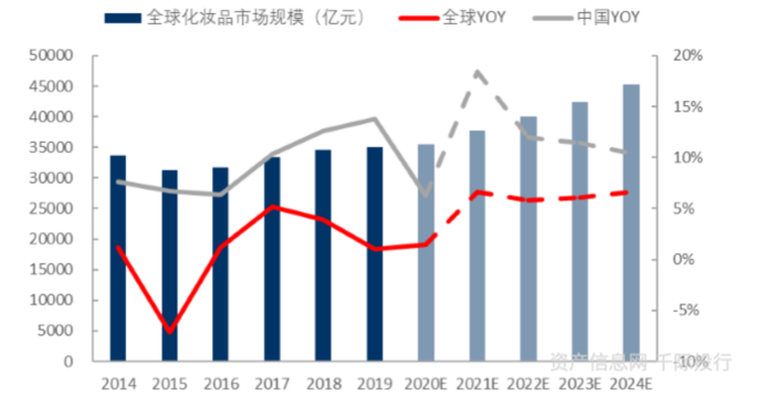 图预计中国护肤品市场规模24年达到637亿美元,20-24年CAGR超14%