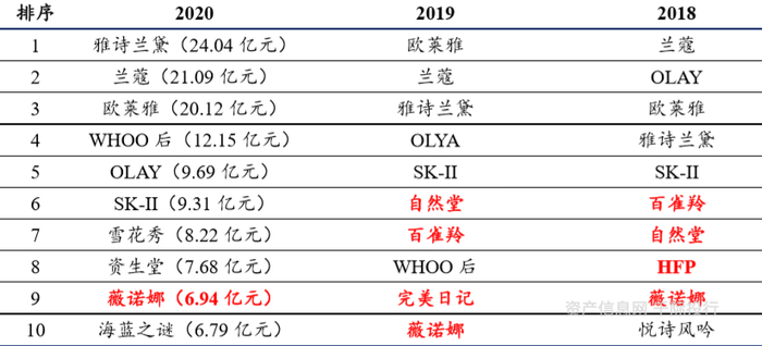 图 2018-2020 年天猫双十一美妆 TOP10 排行榜