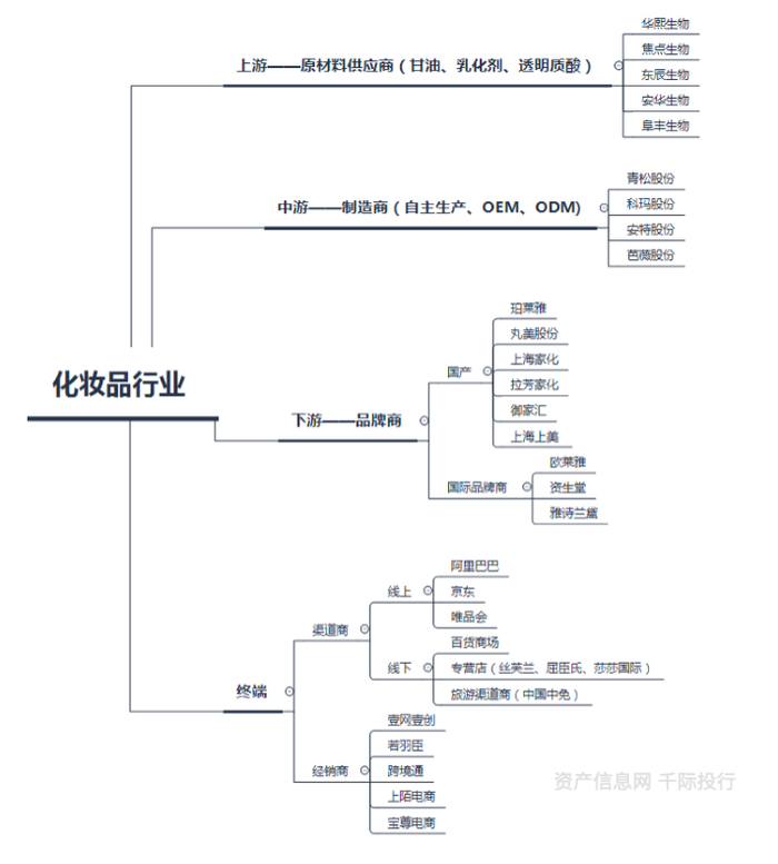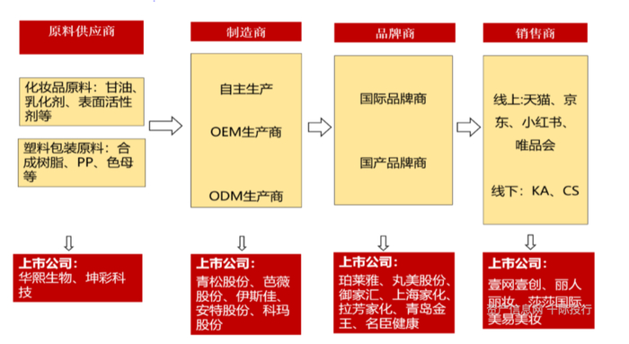 化妆品中游为化妆生产,生产模式为自主生产和代工生产(ODM、OEM、OBM)。据悉,我国化妆品生产环节较为成熟,主要由于早期人力成本低,大型化妆品生产商都在华设立工厂,导致这个赛道的技术水平积累较为成熟。