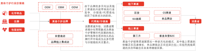 化妆品行业下游商品流通渠道由线上和线下两方面构成。近年来,随着我国电商行业趋于稳定,线上渠道模式逐渐多元化,化妆品线上渠道包括垂直电商平台、社交电商平台、综合B2C平台和部分新兴渠道等。