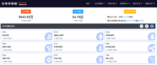 随着涨幅进一步扩大,越来越多的空头爆仓,据比特币家园网最新数据显示,近24小时共有75101人爆仓,4.76亿美元(约30.78亿人民币)被蒸发。