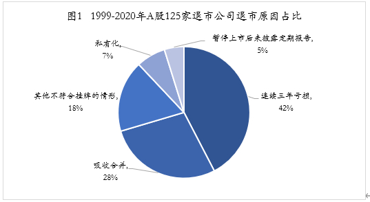 目前整体退市的125家公司中,因连续三年以上亏损退市的有53家,占比近半;因吸收合并退市的有35家;因面值退市、重大违法退市等其他不符合挂牌情形的公司有22家;因私有化退市的有9家;因暂停上市后未披露定期报告的有6家。