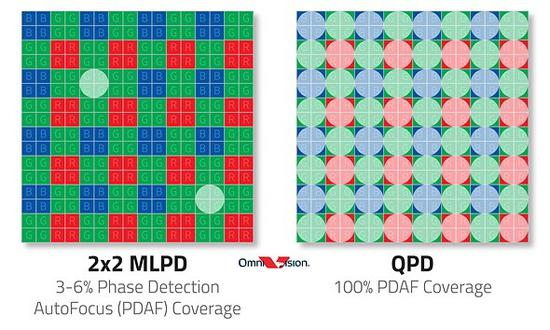 据介绍,QPD 自动对焦技术的运作与佳能的 Dual Pixel AF 技术不同。佳能在单个微透镜的下方只有左右两个像素,而 OmniVision 将每个微透镜的四个像素对角地配对,以实现对焦。这种设计的优势在于,四个对角线像素提供了十字型(水平和垂直)感光度,无论相机和拍摄对象的方向如何,都可获得稳定的性能。