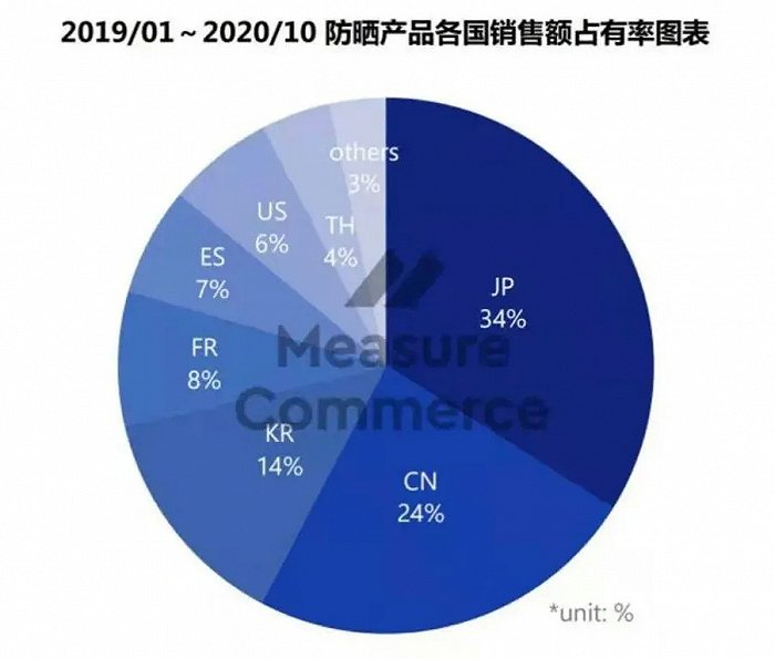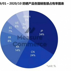 MeasureCommerce分析数据指出,2019年1月—2020年10月,来自日本、中国和韩国的防晒产品占据了整个防晒市场淘系电商交易额72%的份额。其中,日本防晒产品占34%,中国防晒产品占24%,韩国防晒产品占14%,位居前三甲。