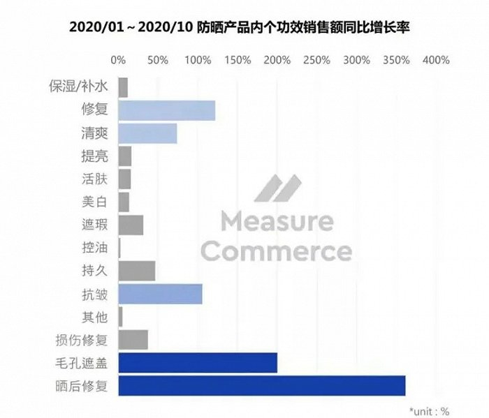 其中,使用之后能够达到晒后修复效果的产品销售增长率超过350%,而能够“遮盖毛孔”的防晒产品销售增长率达到200%。