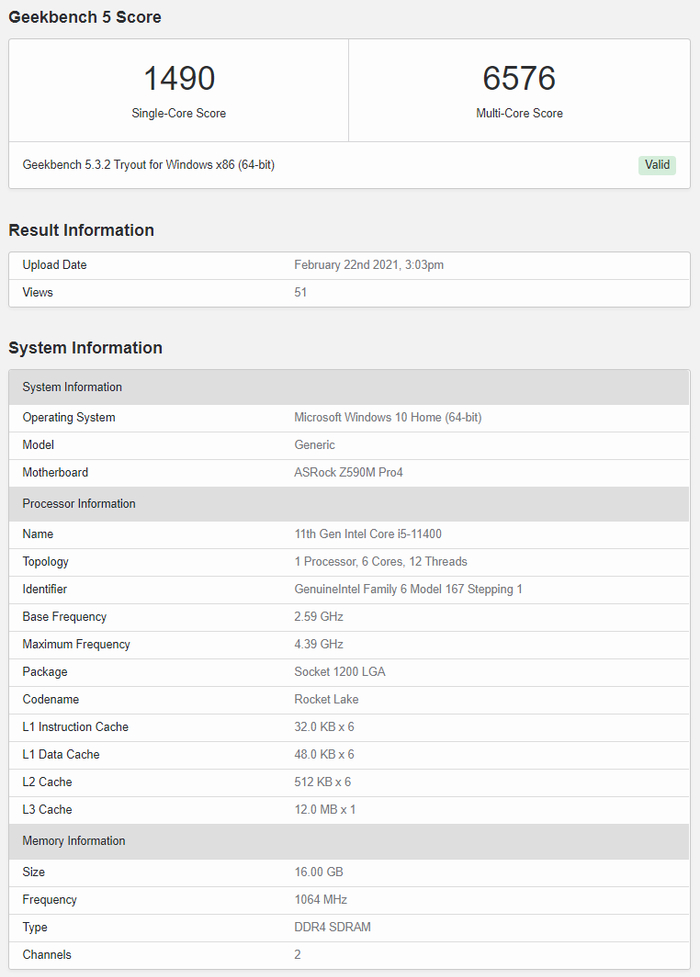 如果没什么意外,Intel将会在3月18日正式发布Rocket Lake 11代桌面酷睿处理器。虽然它还是14nm工艺,但是凭借全新架构,单核性能实现了突飞猛进,之前的曝料也一再证明了这一点。在陆续看过i9、i7系列高端新型号的表现之后,Rocket Lake家族最低端的i5-11400终于出现在了GeekBench 5数据库中,6核心12线程,频率2.6-4.4GHz,二级缓存3MB,三级缓存12MB。