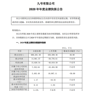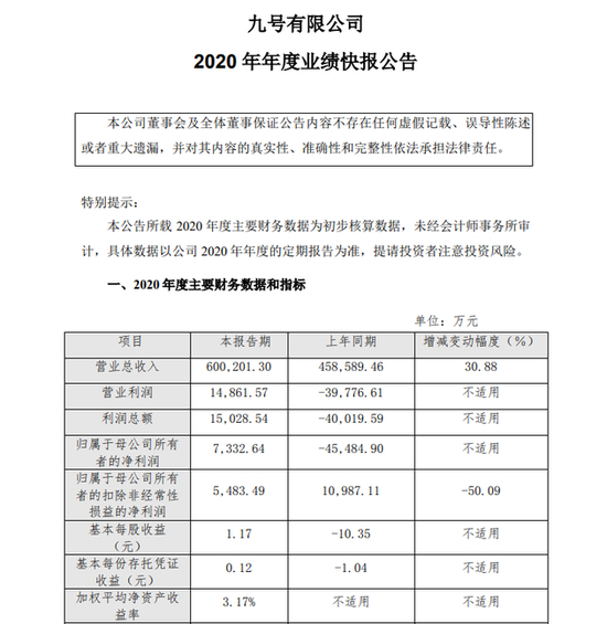 新浪科技讯 2月26日下午消息,九号公司发布业绩快报,报告显示,公司2020年营收60.02亿元,同比增长30.88%;实现净利润7332.64万元,同比扭亏;基本每股收益1.17元。2020年,公司主营业务稳步发展,市场规模持续扩大,电动滑板车等主要产品实现同比增长,同时电动自行车、电动摩托车正式投入市场,公司销售能力不断提升、销售渠道不断拓展。