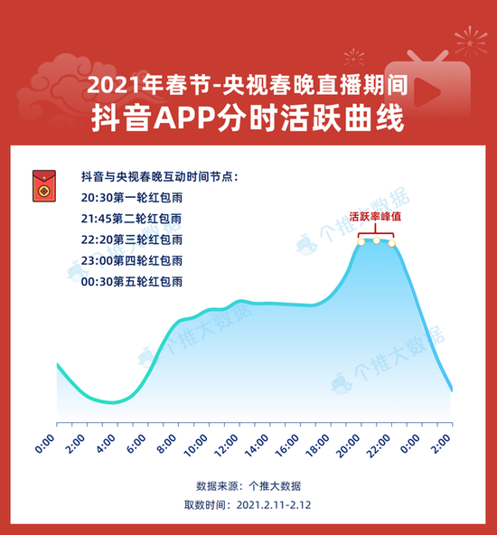 央视春晚强大的引流效应,吸引了很多互联网大厂与其合作。2021春晚抖音成为了独家互动合作伙伴,在近5个小时的春晚直播期间进行了5轮红包雨活动。抖音App除夕当天分时活跃曲线显示,抖音App在20:00-23:00这3个小时内一直维持在活跃高峰。