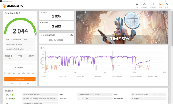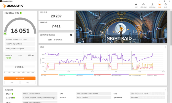 首先是3DMark的跑分,在这里,我们分别用了针对家用级笔记本电脑与普通游戏本的两种测试,分数如下: