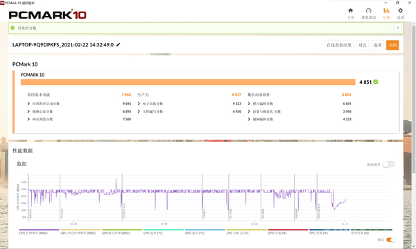 随后,我们也用可以考验笔记本电脑综合性能的PC Mark日常办公等级测试进行了跑分,分数如下: