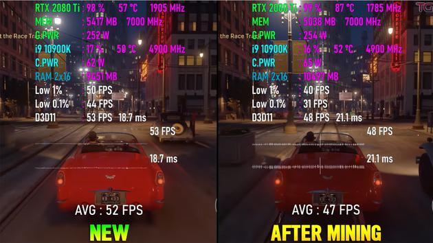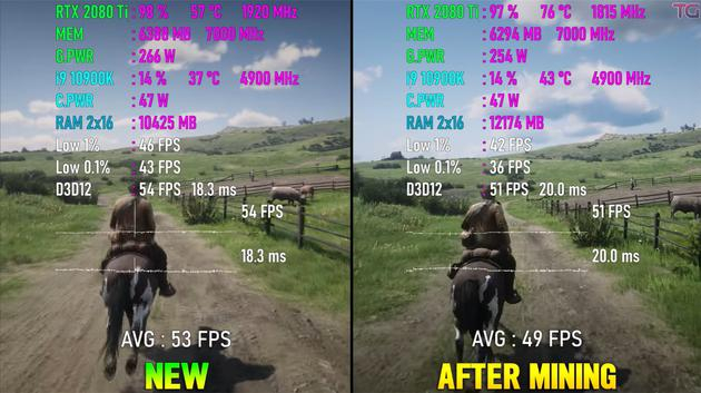 外媒用《荒野大镖客:救赎 2》、《赛博朋克 2077》、《战地 5》等游戏进行对比。结果显示,经过挖矿后的 RTX 2080Ti 显卡游戏帧率凭据平均要低 5 帧左右,新显卡的核心温度一直稳定在 56℃左右,矿卡温度则高达 75℃左右,平均温差 20℃,最高温差可达 30℃。与此同时,挖矿过后的显卡 GPU 核心频率有不同程度的下滑,全新的 RTX 2080Ti 可稳定在 1920MHz,而另一块只能达到 1800MHz 甚至更低。