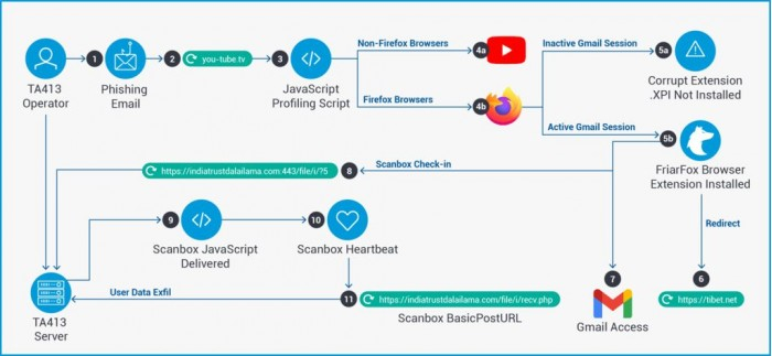 根据网络安全公司 Proofpoint 近期发布的调查报告,一个代号为 TA413 的组织近日利用恶意的 Firefox 插件,窃取 Gmail 和 Firefox 浏览器数据,然后在受感染的设备下载恶意软件。Proofpoint 表示该黑客组织使用鱼叉式钓鱼邮件来引诱用户点击,并提示他们安装 Flash 更新以查看网站内容。