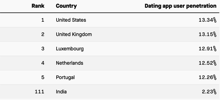 但尽管有这么大的文化阻力存在,印度的约会市场依然在不断扩大。根据Statista2020年的在线约会服务报告,印度的交友用户大约有3800万,以收入来排名,印度仅次于美国和中国。